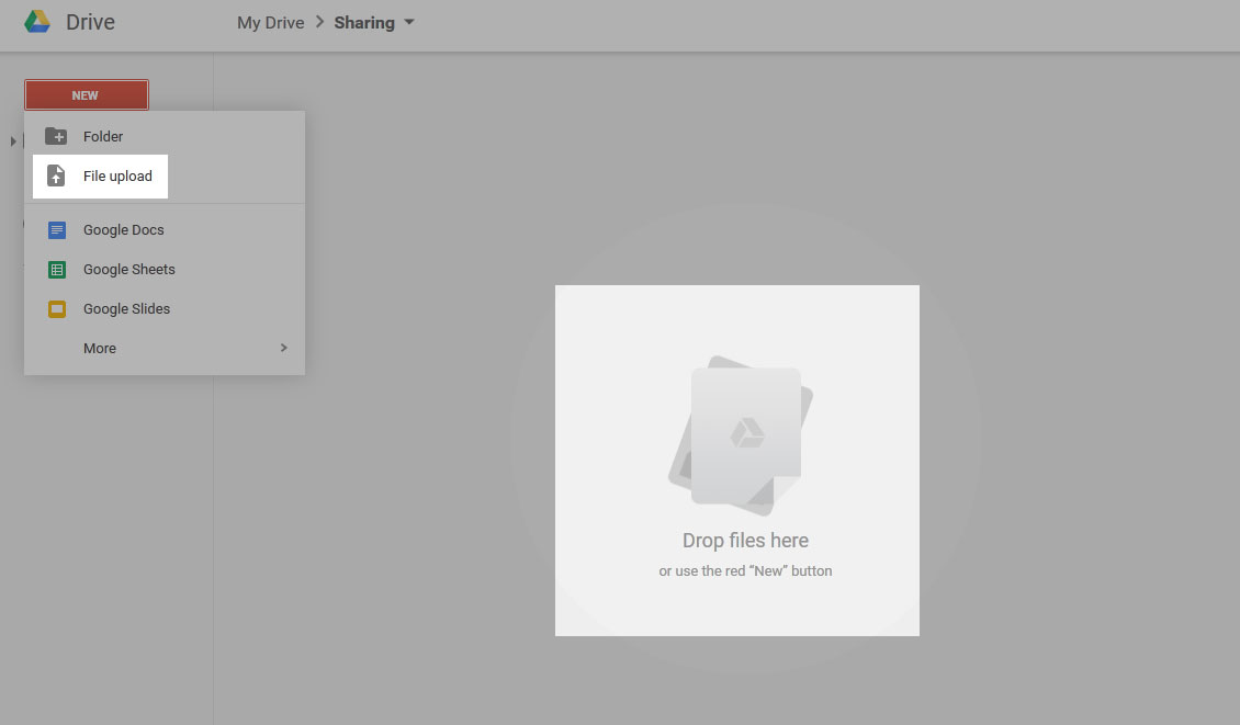 3. Once you are inside the folder, upload your files. You can do this by clicking the New button and then File Upload, or you can drag and drop the files directly into your browser.